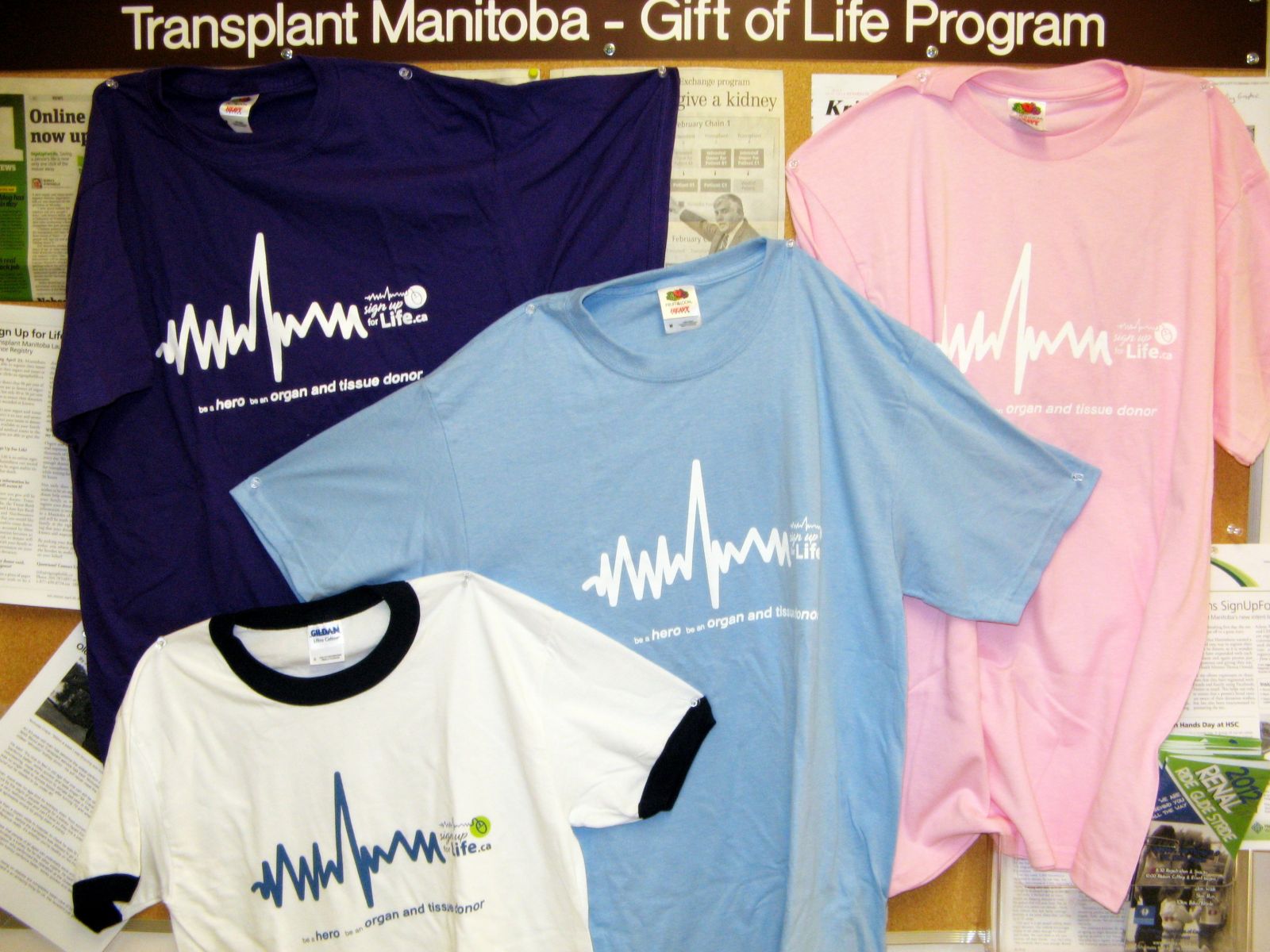 Shirts are available in sizes small through 2XL in a variety of colours. To get yours, call us at 204-787-1897 or email transplantmanitoba@hsc.mb.ca.